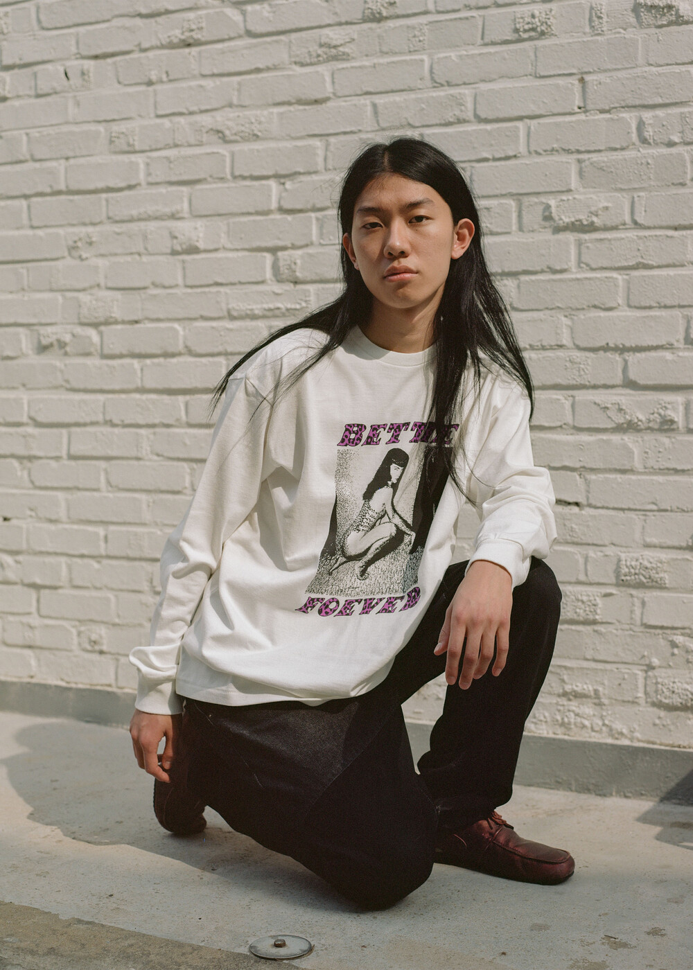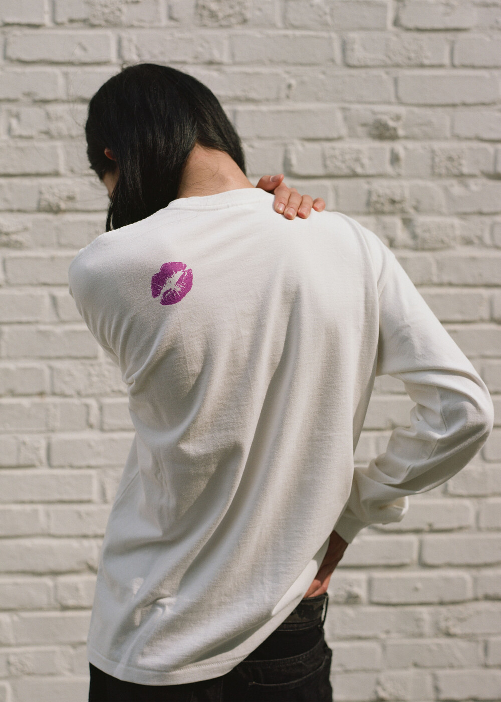 Purple Lips LS T-shirt의 앞판 아트워크는 50년대 Bunny Yeager가 찍은 핀업 걸 Bettie Page 사진을 편집하여 작업하였습니다. 희석된 플라스틱 졸 염료를 사용하여 빈티지한 분위기를 연출하였습니다.
